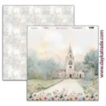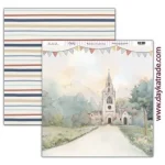 Papel para Scrapbooking Dayka, delantera de iglesia y fondo de textos.