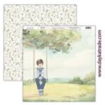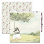 Papel para Scrapbooking Dayka, delantera de paisaje con árbol y niña de comunión con dos trenzas sentada en el columpio. Trasera de conejos y flores.