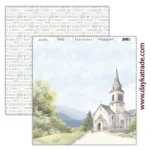 Papel para Scrapbooking Dayka, delantera de iglesia y fondo de textos.