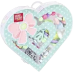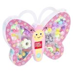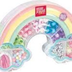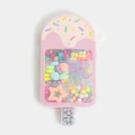 El set destaca por su cuidada selección de cuentas de plástico en colores pastel y multicolor, con variados diseños que incluyen estrellas y formas divertidas. Viene presentado en una práctica caja de plástico hermética con forma de helado, ideal para mantener todo organizado o para llevar la diversión a cualquier parte.