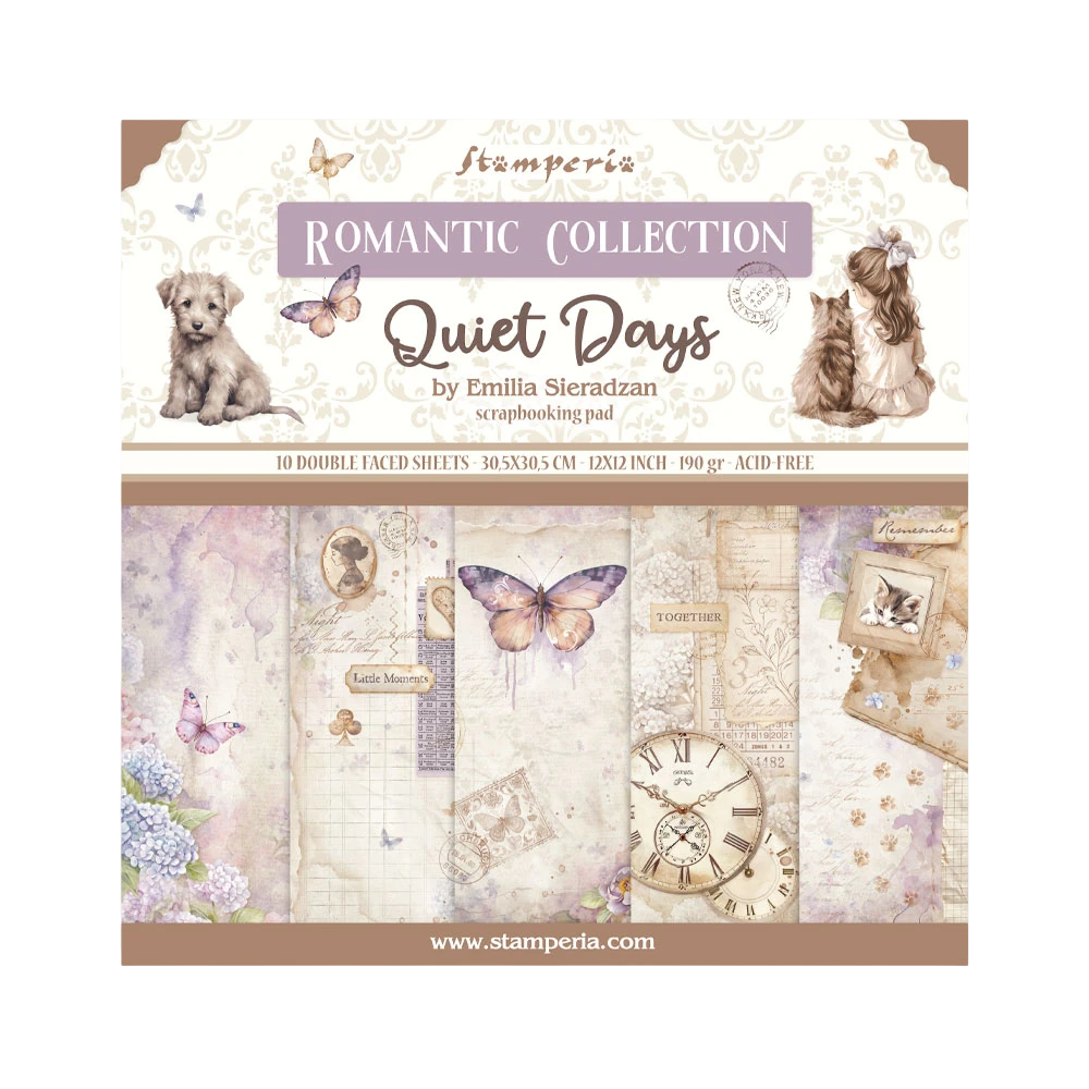 Papeles decorativos para scrapbooking ideales para crear álbumes, layouts, tarjetas, journals, agendas y proyectos de papelería creativa. Esta colección presenta un estilo romántico y vintage, con ilustraciones suaves de mariposas, flores, relojes antiguos, niños, mascotas y fondos envejecidos en tonos pastel.