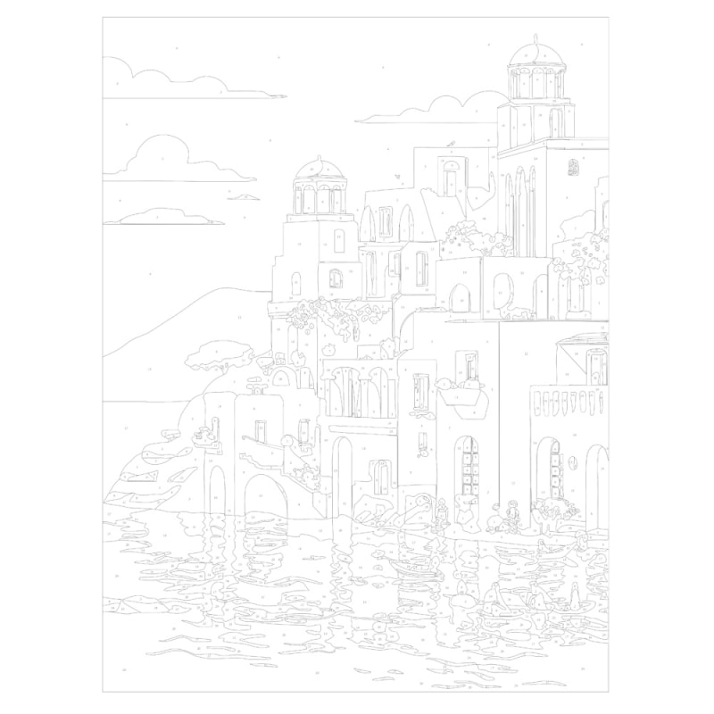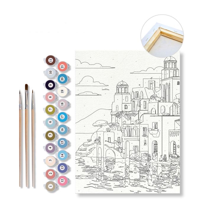 El conjunto de pintar por números incluye: 1 lienzo numerado de 40×30 cm. 21 pinturas acrílicas de 3 ml numeradas. 3 pinceles: fino, medio y grueso. Imagen a color de referencia. Patrón numérico para pintar el lienzo.