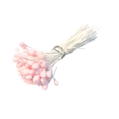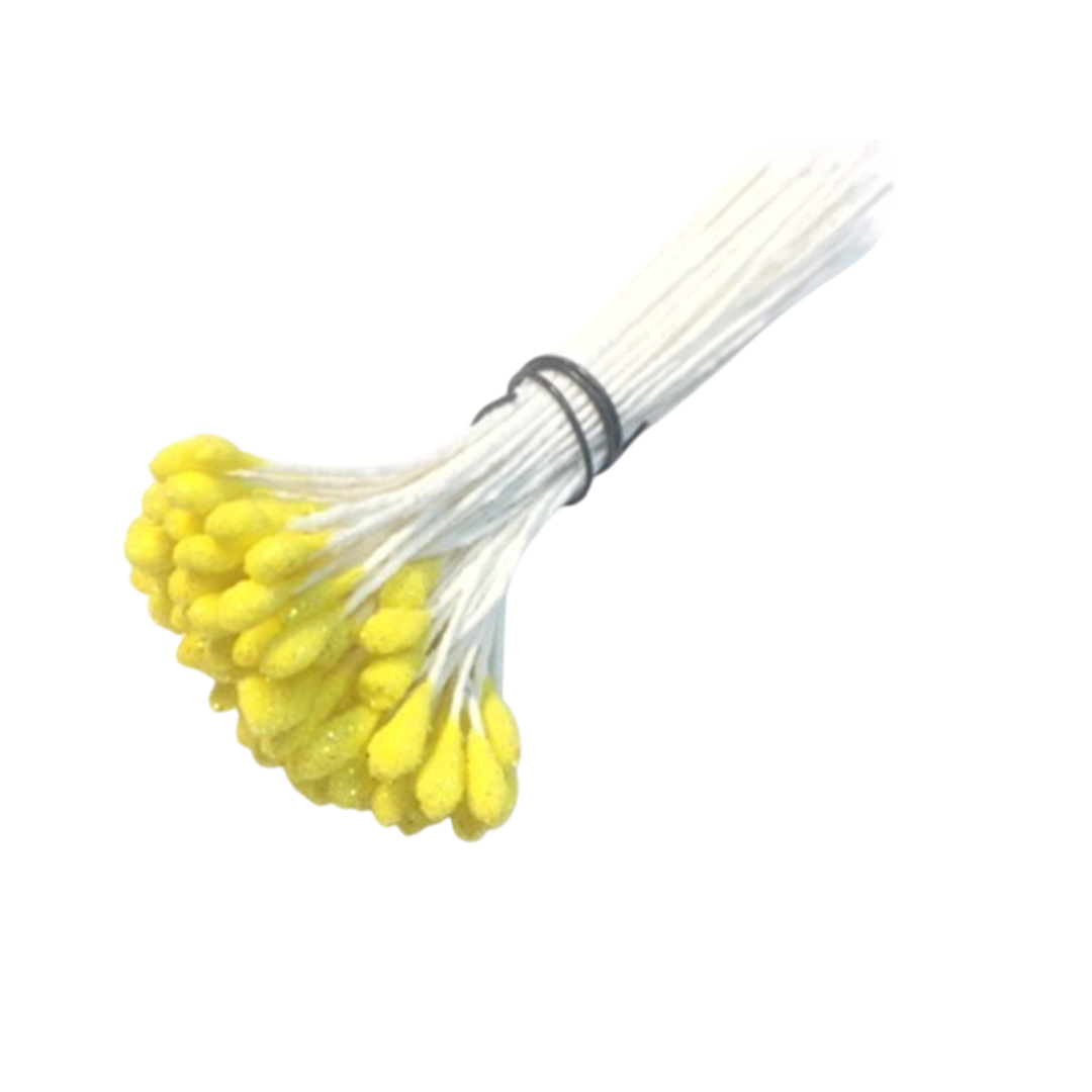 Pistilo con purpurina efecto irisado 115-120 unidades por pomo Altura: 8 cm Diámetro de la cabeza: 3 mm. aprox. UTILIZACIÓN: Creación de flores, adornos florales, flores de tela, flores para boda, flores para sombrero, flores para pamela.